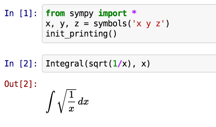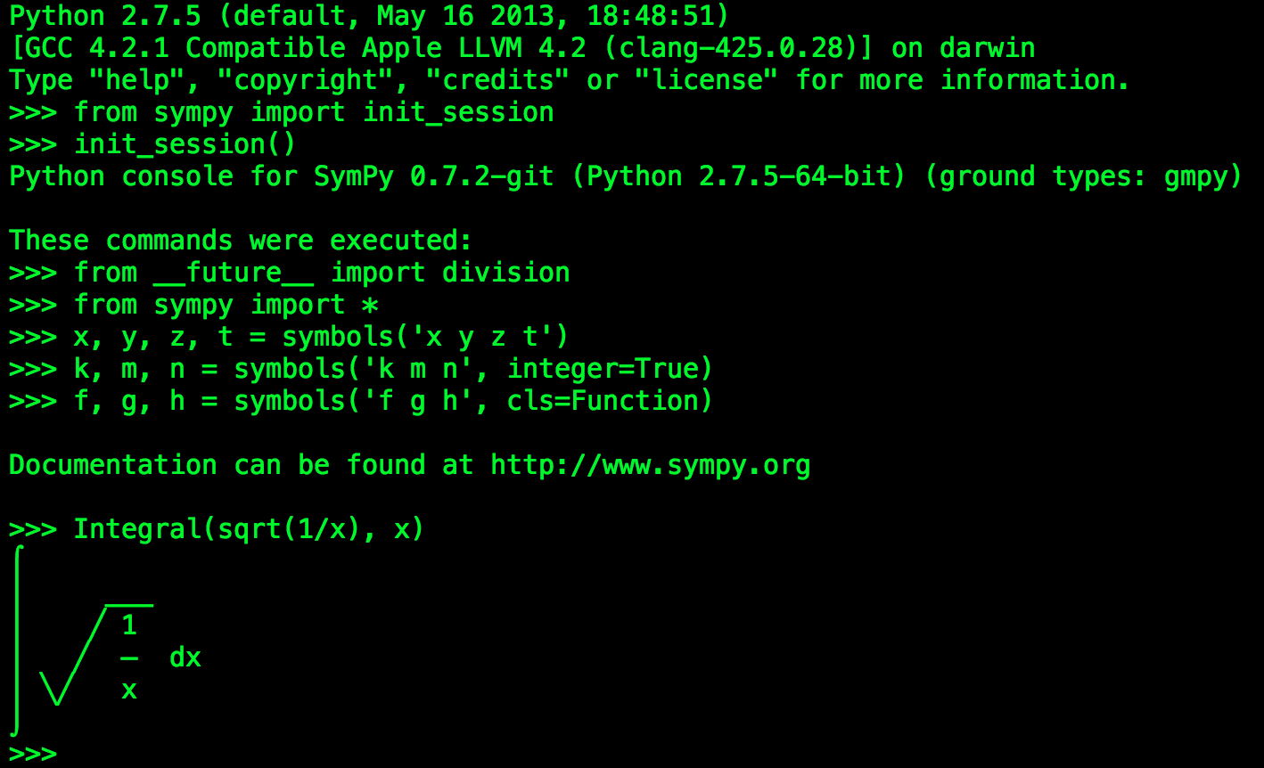 >>> from sympy import init_session >>> init_session()Python console for SymPy 0.7.3 (Python 2.7.5-64-bit) (ground types: gmpy) These commands were executed: >>> from __future__ import division >>> from sympy import * >>> x, y, z, t = symbols('x y z t') >>> k, m, n = symbols('k m n', integer=True) >>> f, g, h = symbols('f g h', cls=Function) >>> init_printing() # doctest: +SKIP Documentation can be found at http://www.sympy.org>>>