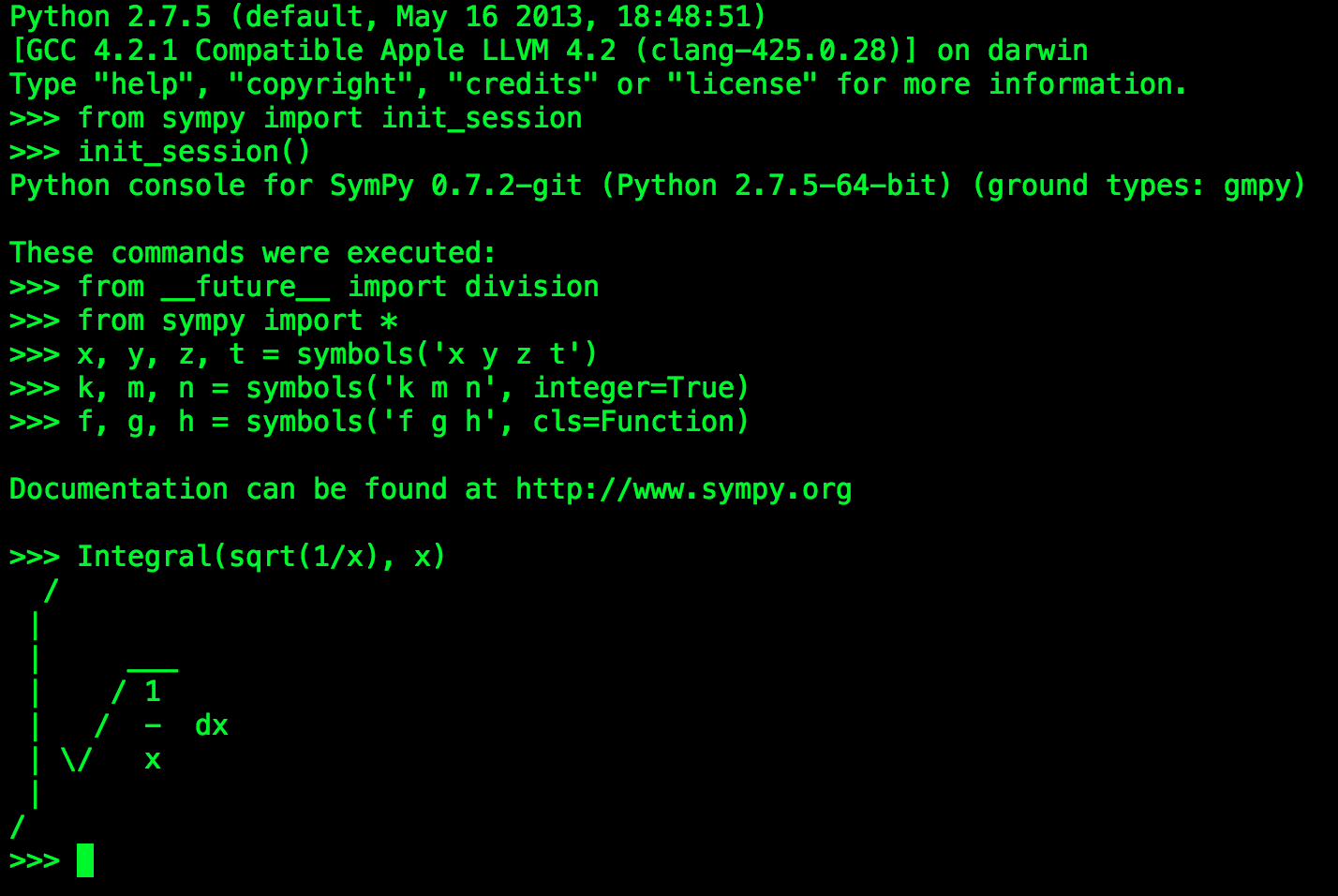 >>> from sympy import init_session >>> init_session()Python console for SymPy 0.7.3 (Python 2.7.5-64-bit) (ground types: gmpy) These commands were executed: >>> from __future__ import division >>> from sympy import * >>> x, y, z, t = symbols('x y z t') >>> k, m, n = symbols('k m n', integer=True) >>> f, g, h = symbols('f g h', cls=Function) >>> init_printing() # doctest: +SKIP Documentation can be found at http://www.sympy.org>>>
