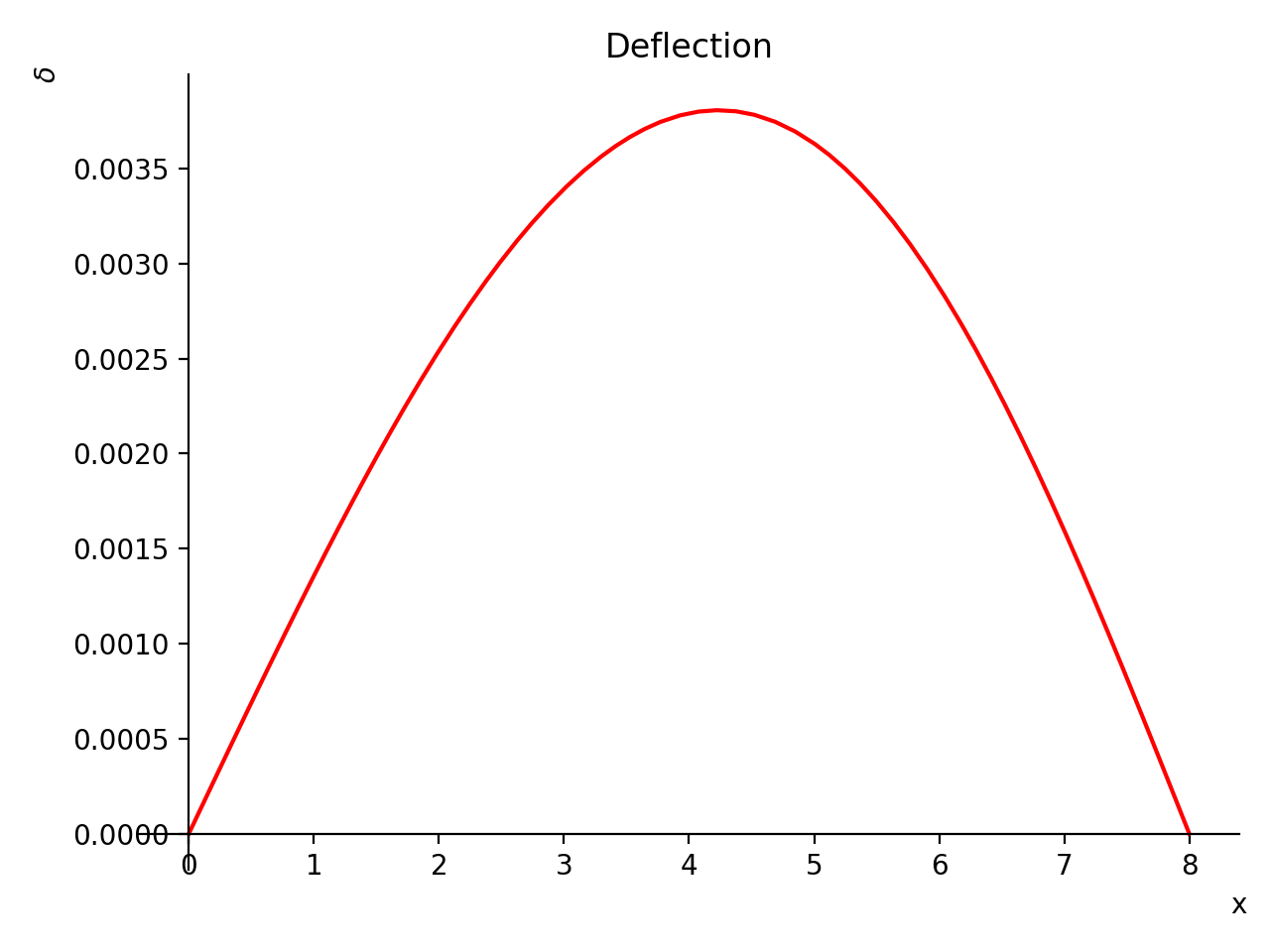 >>> from sympy.physics.continuum_mechanics.beam import Beam3D >>> from sympy import symbols >>> l, E, G, I, A, x = symbols('l, E, G, I, A, x') >>> b = Beam3D(20, 40, 21, 100, 25, x) >>> b.apply_load(15, start=0, order=0, dir="z") >>> b.apply_load(12*x, start=0, order=0, dir="y") >>> b.bc_deflection = [(0, [0, 0, 0]), (20, [0, 0, 0])] >>> R1, R2, R3, R4 = symbols('R1, R2, R3, R4') >>> b.apply_load(R1, start=0, order=-1, dir="z") >>> b.apply_load(R2, start=20, order=-1, dir="z") >>> b.apply_load(R3, start=0, order=-1, dir="y") >>> b.apply_load(R4, start=20, order=-1, dir="y") >>> b.solve_for_reaction_loads(R1, R2, R3, R4) >>> b.solve_slope_deflection() >>> b.max_deflection() [(0, 0), (10, 495/14), (-10 + 10*sqrt(10793)/43, (10 - 10*sqrt(10793)/43)**3/160 - 20/7 + (10 - 10*sqrt(10793)/43)**4/6400 + 20*sqrt(10793)/301 + 27*(10 - 10*sqrt(10793)/43)**2/560)]