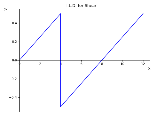 There is a beam of length 12 meters. There are two simple supports below the beam, one at the starting point and another at a distance of 8 meters. Calculate the I.L.D. equations for Shear at a distance of 4 meters under the effect of a moving load of magnitude 1kN.
