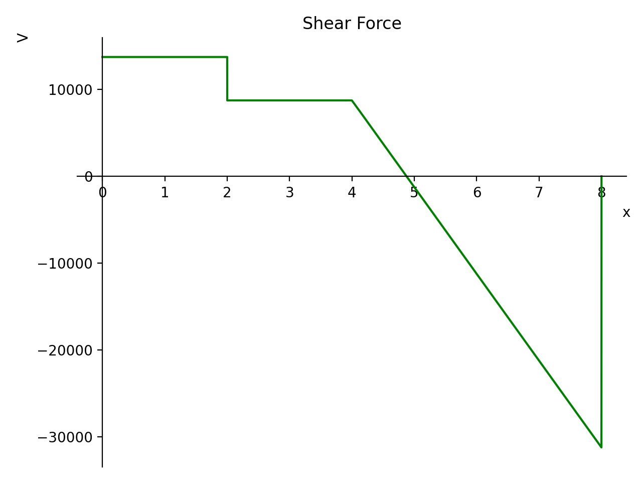 >>> from sympy.physics.continuum_mechanics.beam import Beam3D >>> from sympy import symbols >>> l, E, G, I, A, x = symbols('l, E, G, I, A, x') >>> b = Beam3D(20, E, G, I, A, x) >>> b.apply_load(15, start=0, order=0, dir="z") >>> b.apply_load(12*x, start=0, order=0, dir="y") >>> b.bc_deflection = [(0, [0, 0, 0]), (20, [0, 0, 0])] >>> R1, R2, R3, R4 = symbols('R1, R2, R3, R4') >>> b.apply_load(R1, start=0, order=-1, dir="z") >>> b.apply_load(R2, start=20, order=-1, dir="z") >>> b.apply_load(R3, start=0, order=-1, dir="y") >>> b.apply_load(R4, start=20, order=-1, dir="y") >>> b.solve_for_reaction_loads(R1, R2, R3, R4) >>> b.plot_shear_force() PlotGrid object containing: Plot[0]:Plot object containing: [0]: cartesian line: 0 for x over (0.0, 20.0) Plot[1]:Plot object containing: [0]: cartesian line: -6*x**2 for x over (0.0, 20.0) Plot[2]:Plot object containing: [0]: cartesian line: -15*x for x over (0.0, 20.0)